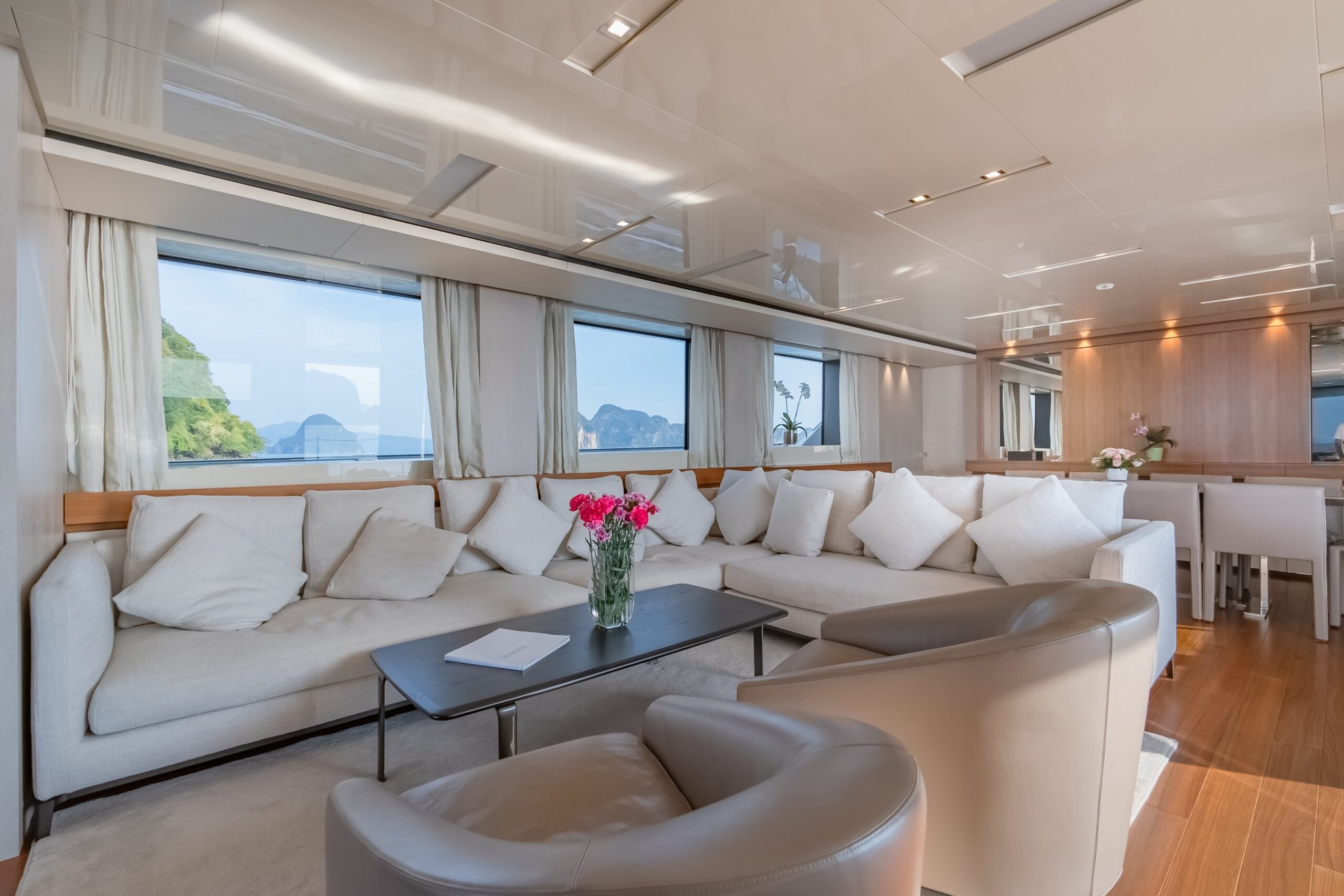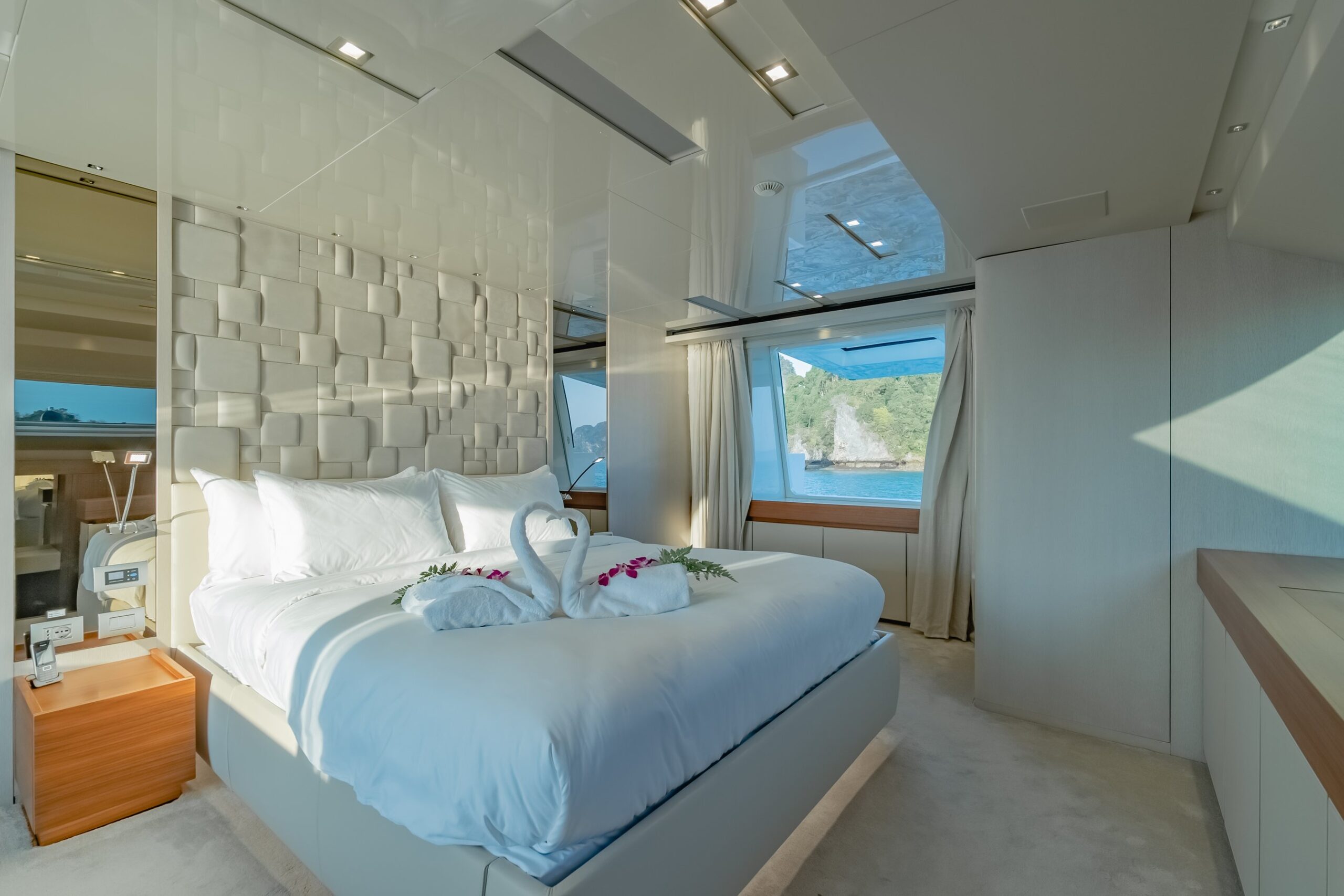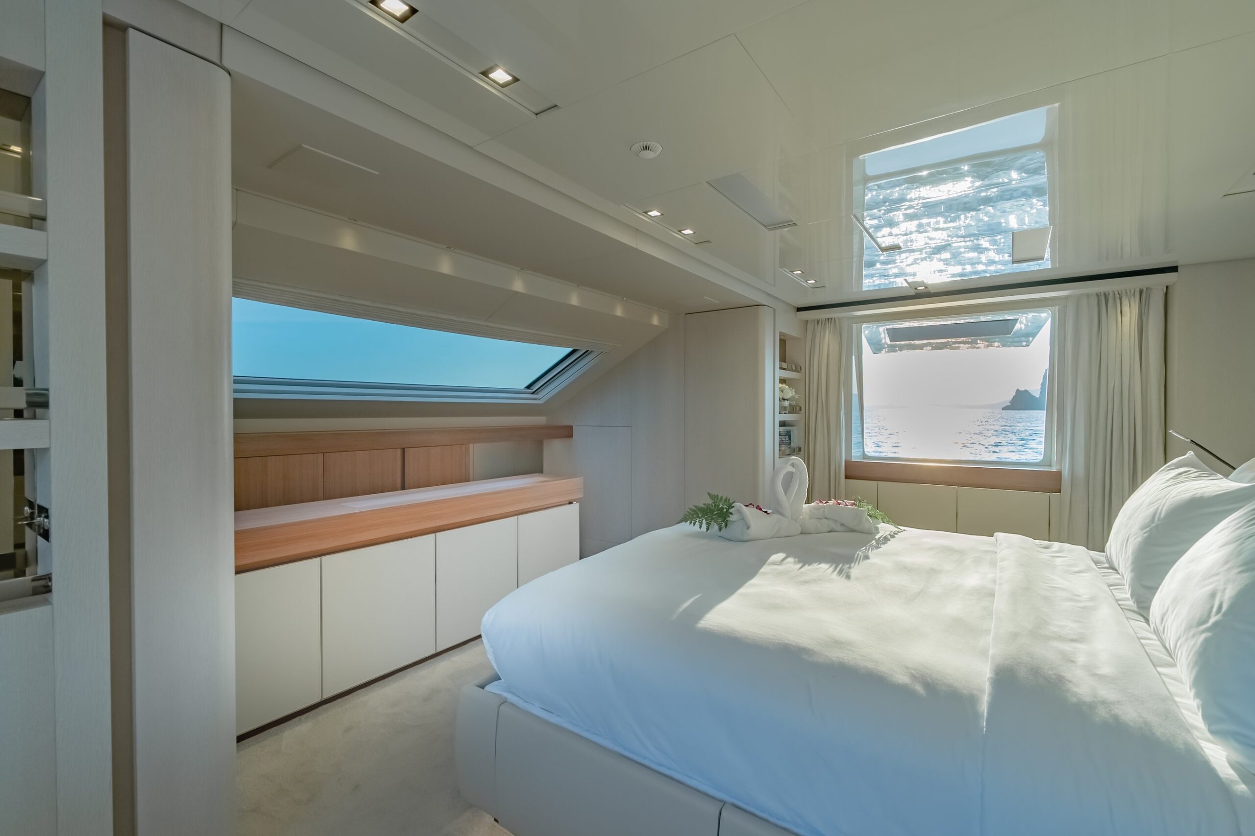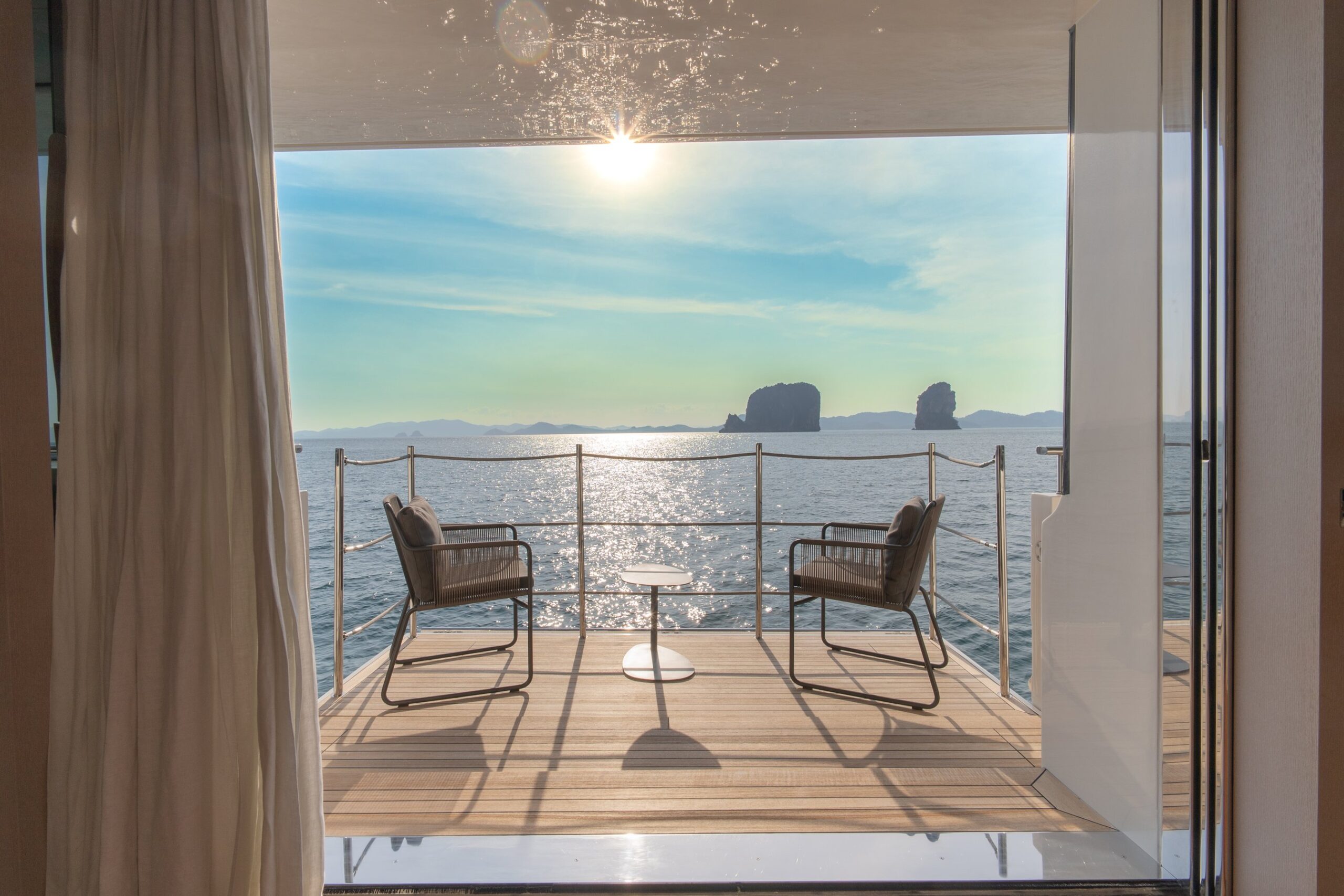 A highlight of OCTAVE is the full-beam master cabin, located forward on the main deck. It features hydraulic opening gullwing doors on both sides, creating an open, naturally lit environment with captivating sea views and refreshing ocean breeze. The main saloon is equally impressive, offering a starboard-side balcony that opens directly to the sea — perfect for enjoying the scenery while underway or at anchor.