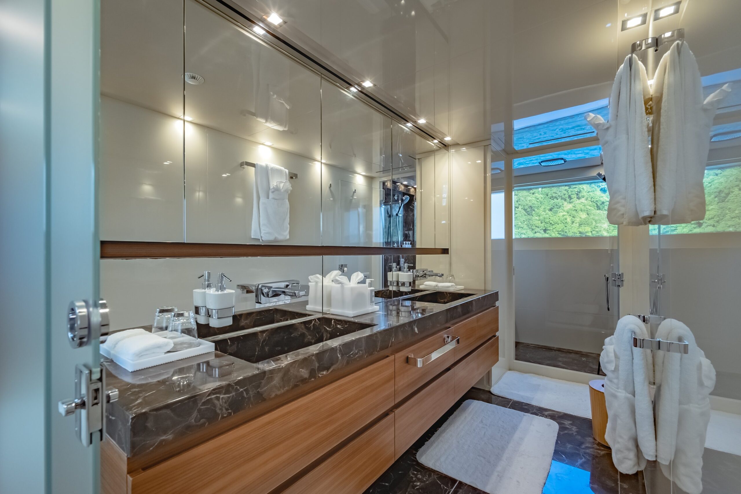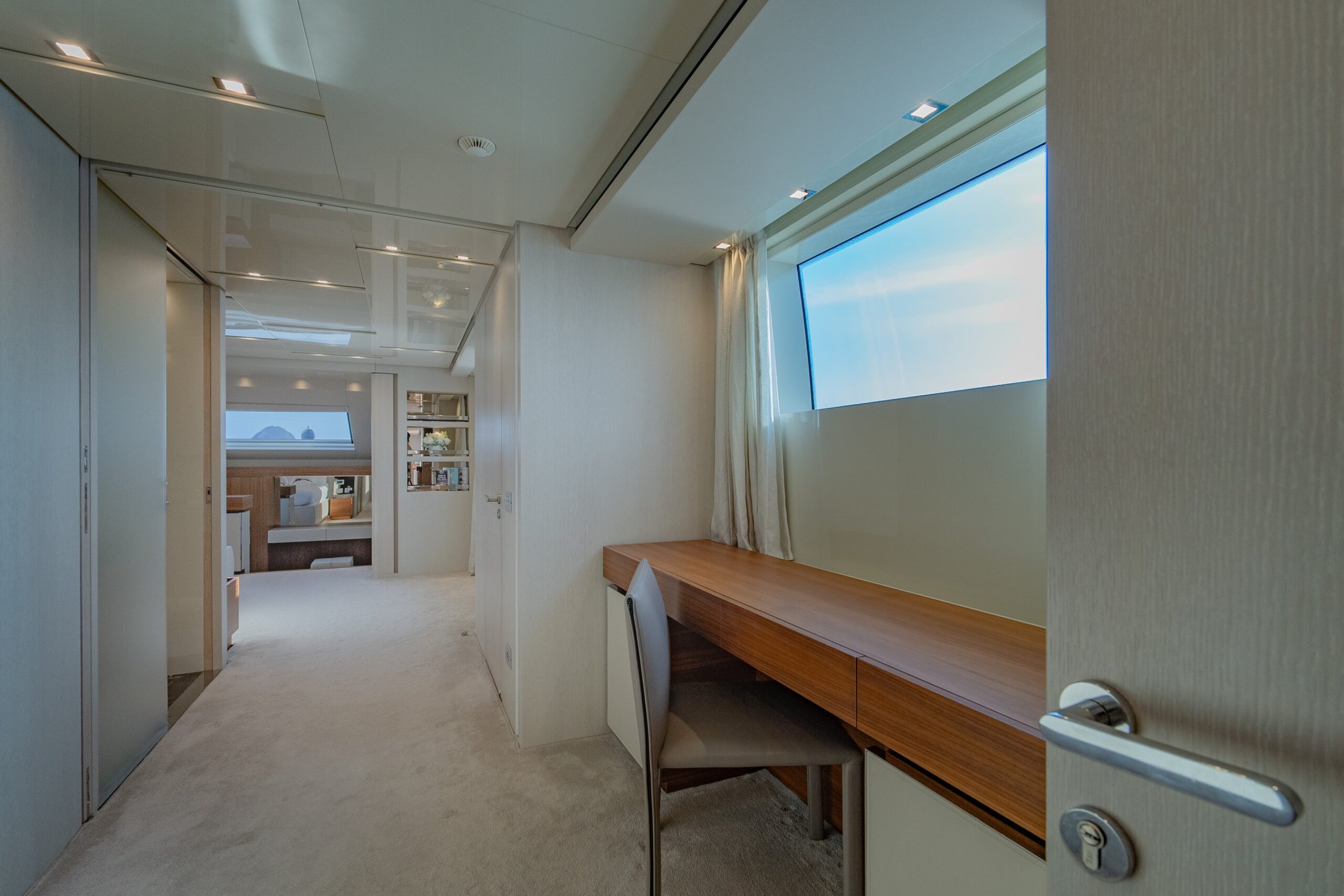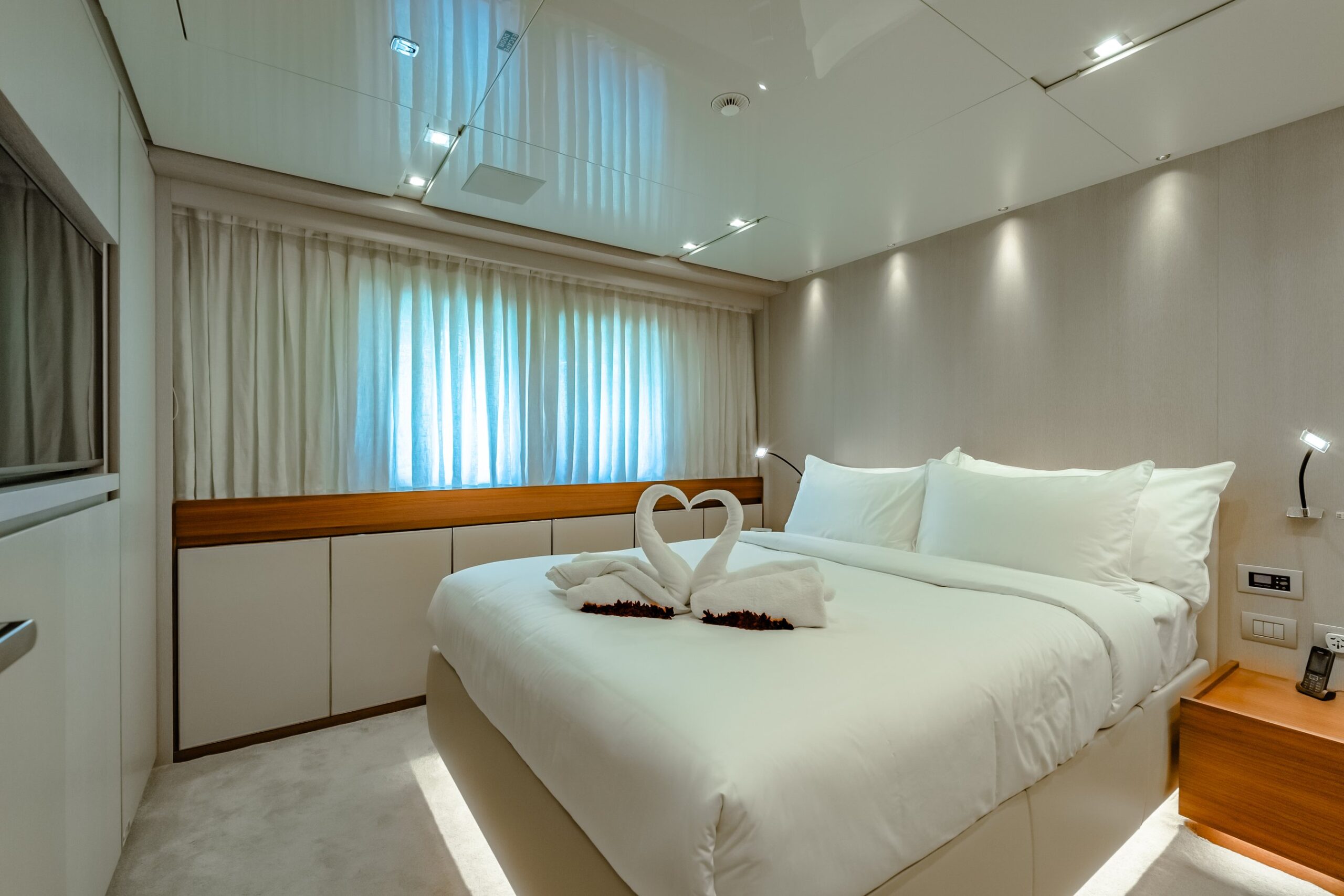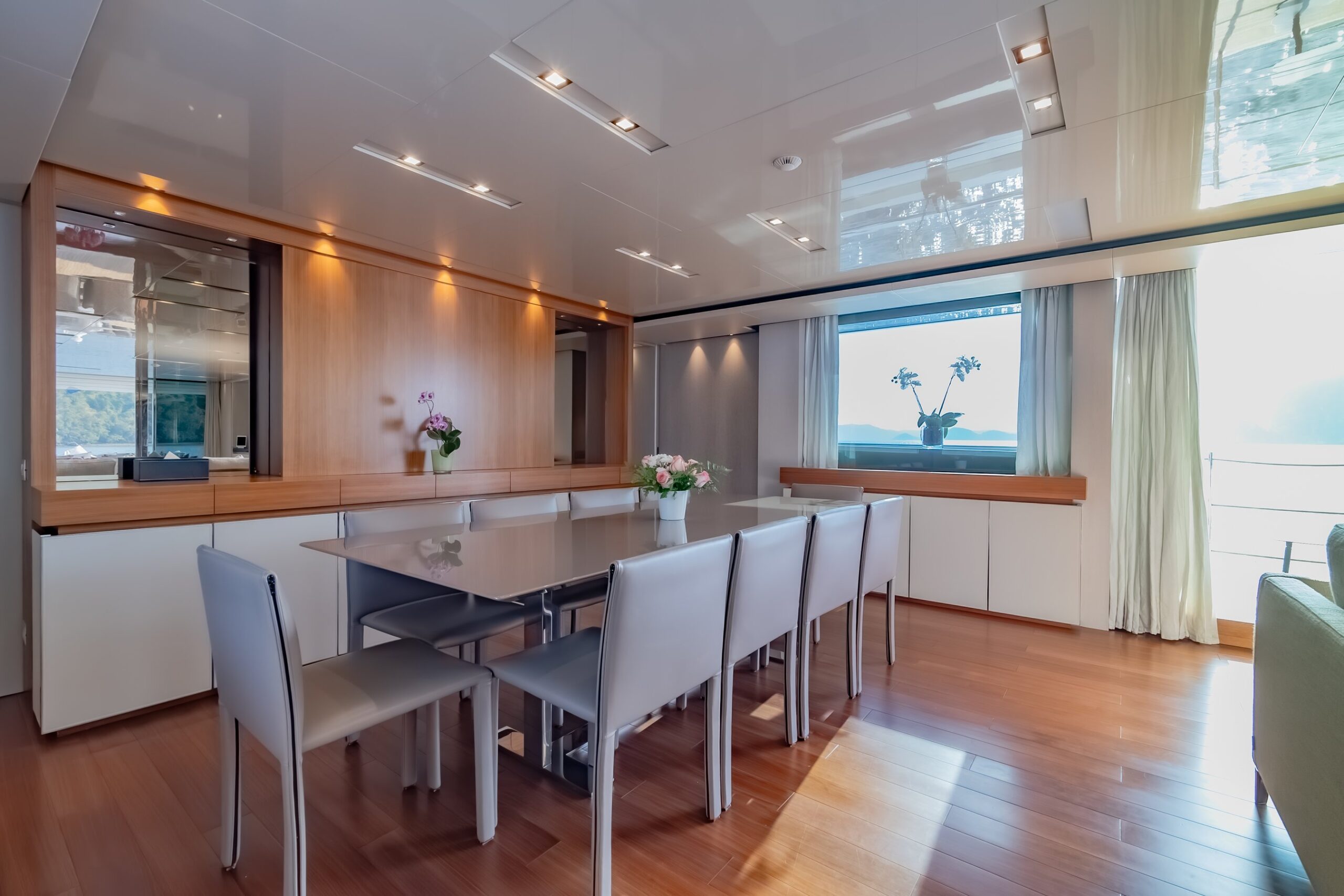A highlight of OCTAVE is the full-beam master cabin, located forward on the main deck. It features hydraulic opening gullwing doors on both sides, creating an open, naturally lit environment with captivating sea views and refreshing ocean breeze. The main saloon is equally impressive, offering a starboard-side balcony that opens directly to the sea — perfect for enjoying the scenery while underway or at anchor.