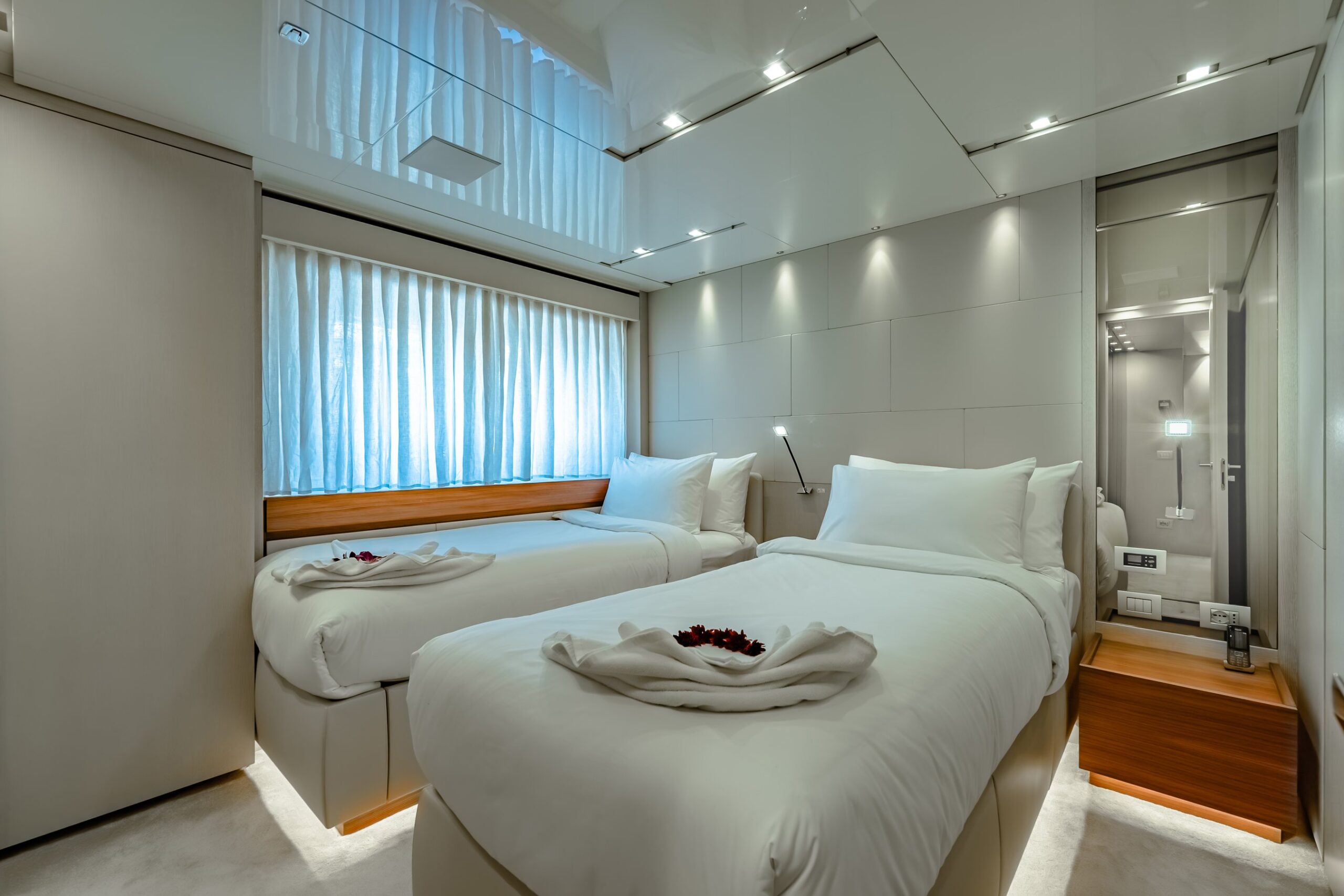 On the lower deck, accommodation includes two VIP cabins and two twin cabins, all en suite, providing privacy and comfort for every guest. The interior is elegantly appointed with American walnut, parquet flooring on the main deck, and soft, light carpeting throughout, offering an atmosphere that is both refined and welcoming.